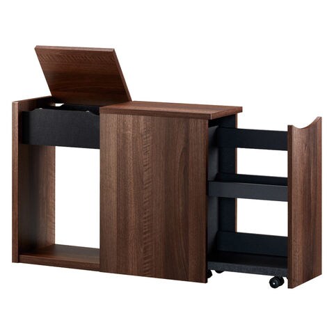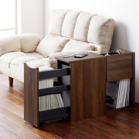 ■商品紹介:ソファ脇のスリム収納庫。奥行のあるタイプです。ワゴンをスライドしたらコミック収納になっています。ワゴンの背板は左右どちらでも組立可能です。後方のオープンスペースはA4ファイルや雑誌も置けます。後方上部の蓋式小物収納にはティッシュや電源タップなどが収納出来ます。耐荷重量 : 天板約10?kg・棚板約5kg・ボックス約5kg。
