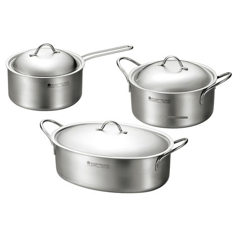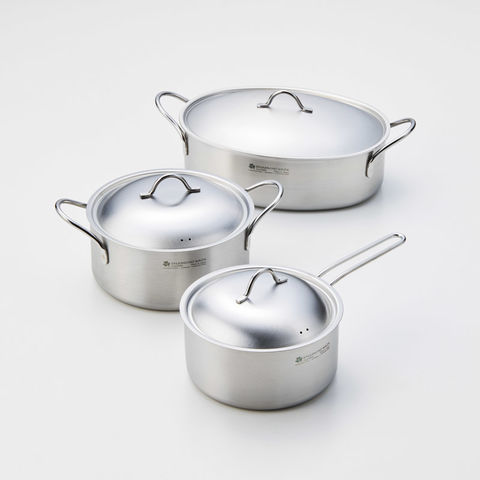 ■商品内容:片手鍋18cm(18.5×32.5×14.5cm・2.2L)・両手鍋20cm(20.8×29×15cm・2.8L)・オーバルパン28cm(21.3×36.8×15cm・4.3L)×各1・ステンレス鋼、アルミニウム(三層構造)
