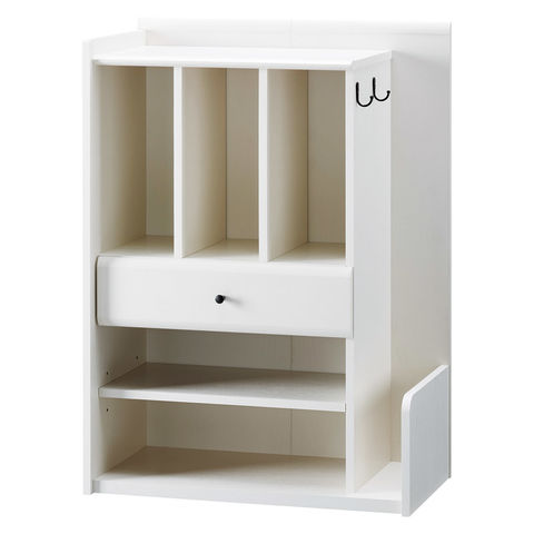 ■商品紹介:お子様一人で整理整頓の習慣が身につきます。上置き棚にはランドセルが収納出来、ランドセルの収納スペースと教科書類の収納スペースを近くすることで、出し入れの動作を小さく出来ます。本棚部には教科書、引き出し部には筆記用具、下部収納箇所には引き出しや本棚に入らない習字セットや絵の具など。可動棚1枚。縦収納箇所はピアニカ(鍵盤ハーモニカ)や図工作品などを収納出来、左右フックには水筒などを引っ掛けることが出来ます。背面化粧なので来客時はひっくり返して隠すことも出来ます。耐荷重量:天板:10kg、棚板10kg、引出し5kg。