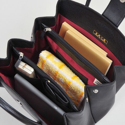 ■商品紹介:マチがジャバラ式になっているので、中身が取り出しやすく収納力もバツグンです。日本製で職人が昔ながらの手作業で製作しているので、丁寧で丈夫な仕上がり。生地から細部の部材まで妥協を許さないこだわり。ベロ付マグネットホック開閉式。中仕切りファスナーポケット・オープンポケット×各2室、名刺入×1室。側面にジャバラ調整ホック付。持ち手立上り約8cm。