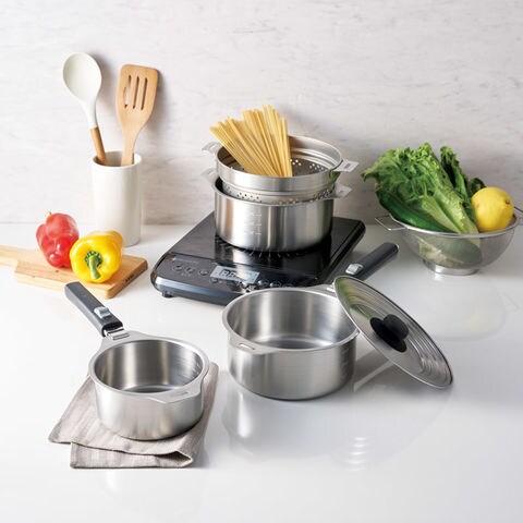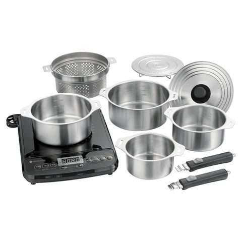 ■商品内容:鍋14cm(20×15.5×7.4cm・1.1L)・鍋16cm(22×17.5×7.8cm・1.6L)・鍋18cm(24×19.5×8.3cm・2.1L)・鍋20cm(26×21.5×8.8cm・2.8L)・兼用蓋・蒸し台・中かご・IHクッキングヒーター(27.5×34.5×6cm)×各1、着脱ハンドル×2・鍋・兼用蓋・蒸し台・中かご:ステンレス鋼、IHクッキングヒーター:ABS樹脂・結晶化ガラス