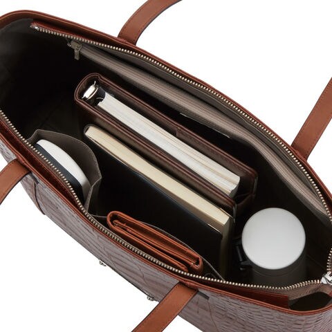■商品紹介:クロコ型押し部分はイタリア製の牛革を使用(他は日本製牛革)。ジェンダーフリーで使えるバッグは、スタイリッシュに持てるデザイン。カジュアルからビジネスまで幅広いシーンで活躍します。落ち着いたブラウンは、どんなコーディネートにも合わせやすく、季節を問わずお使いいただけます。使うほどに風合いが増し、あなたのスタイルにさらに深みを与えます。A4ファイル対応。ファスナー開閉式。内オープンポケット×3室、ファスナーポケット×1室、ホック式キーフック×1。持ち手立上り約23cm。