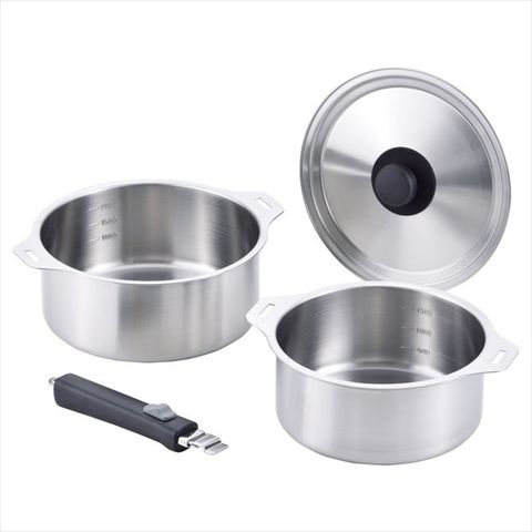 ■商品内容:鍋14㎝(約1.1㍑)(約145×195×73㎜)・鍋16㎝(約1.6㍑)(約165×215×78㎜)・兼用蓋・着脱ハンドル×各1 ステンレス