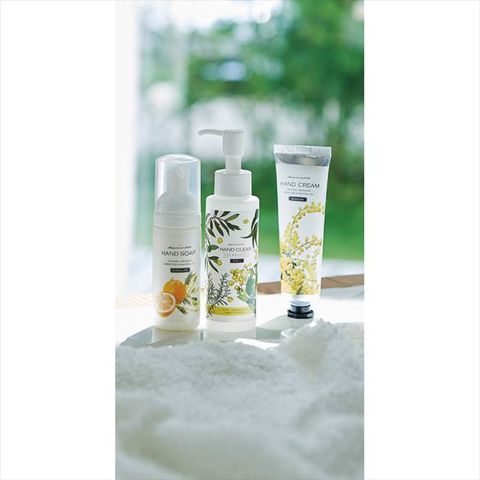 ■商品紹介:ハンドクリーム天然香料ミモザ精油がふんわりと柔らかく香る、するすると伸びる滑らかな使い心地です。ハンドソープさわやかで心落ち着くひとときへと誘う天然香料の香りを楽しみながら、手洗いの時間が素敵なリフレッシュタイムとなるソープです。ハンドクリーンジェル保湿成分ヒアルロン酸と、香料(ティーツリー・ユーカリ・ニアウリ・ラヴィンサラ・ミモザ)のアロマ精油を配合した、ほんのりとアロマの香り漂うジェルです。洗浄成分エタノール配合。スキンソープもっちりと弾力のある濃密な泡が毛穴の汚れをしっかり吸着し、クリアな洗い上がりの固形石鹸です。保湿成分のヘーゼルナッツオイルとアロエベラエキス配合で、洗顔後のお肌を整えてくれます。飽きのこないほんのり香るミモザ精油とグレープフルーツで、毎日の洗顔を豊かな体験に。ボディクリームミモザ精油(香料)がふんわりと柔らかく香る、するすると伸びる滑らかな使い心地のボディクリーム。保湿成分のヘーゼルナッツオイルとアロエベラエキス配合で、しっかり潤うのにべたつかず、柔らかな肌に導きます。
