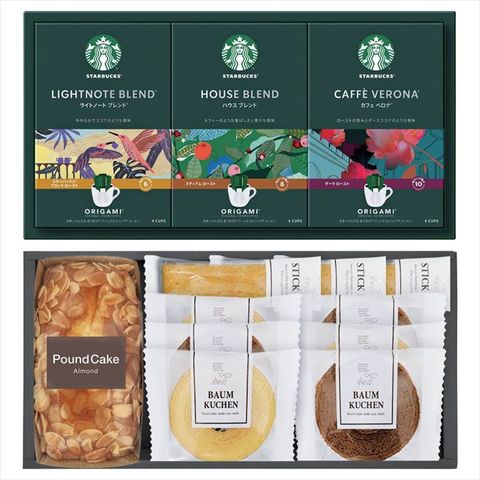 ■商品内容:スターバックスオリガミドリップコーヒー(ハウスブレンド・カフェベロナ・ライトノート×各4)・アーモンドパウンドケーキ×各1、バウムクーヘン(ココア・バニラ)・スティックパイ(プレーン)×各3