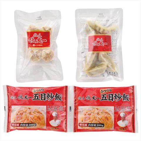 ■商品内容:餃子(6個入)(120g)・貝柱入焼売(4個入)(120g)×各1、ふっくら五目炒飯(200g)×2