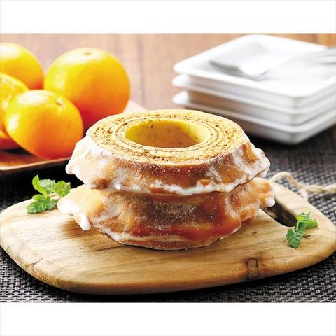 ■商品紹介:「ラ・ベットラ・ダ・オチアイ」落合シェフ監修の、オレンジピールを細かく刻んで生地に練り込み焼き上げたバウムクーヘンです。内側はしっとり、シュガーコーティングした外側はサクッとした食感です。