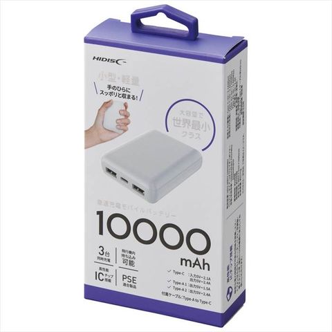 ■商品紹介:ポケットにすっぽり収まるコンパクトボディに、10000mAhの大容量。急速充電、3台同時充電可能なモバイルバッテリー。■USB Type-C入出力対応■3台同時充電可能■保護回路(ショート、過充電、過放電、過電流、過熱防止)