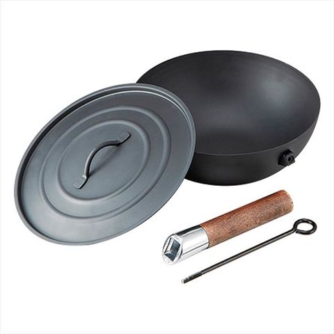 ■商品紹介:アウトドアにピッタリなコンパクトな中華鍋です。大きすぎず、重すぎず、携行性に優れた23㎝の中華鍋で機能は本格的。鍋の内側に目盛が付いています。炒める、焼く、煮る、蒸す、揚げる、炊く、燻製などの調理に対応できます。鉄製のフタで、フタが平なので上に炭を置いてダッチオーブン風の調理もできます。ハンドルは着脱可能なネジ式。収納袋付きでハンドルを外して入れられるのでコンパクトに持ち運びできます。