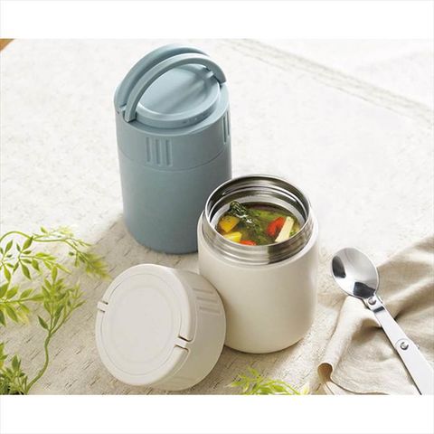 ■商品紹介:真空二重構造でランチまで食べ頃の温度をキープ!折りたたみ式のステンレススプーン付。