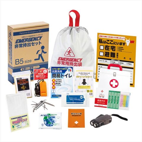 ■商品内容:非常持出袋(約340×300㎜)×1、防災の心得・ホイッスル・レインコート・抗菌消臭トイレ・ダイナモLEDライト・アルミブランケット・除菌アルコールウェットティッシュ・マスク・緊急避難カード・水に流せるペーパー・8徳ナイフ・救急4点セット×各1 ポリエステル