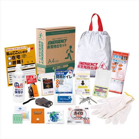 ■商品内容:非常持出袋(約335×390㎜)×1、防災の心得・ホイッスル・カイロ・レインコート・抗菌消臭トイレ・ダイナモLEDライト・軍手・アルミブランケット・マスク・除菌アルコールウェットティッシュ・5年保存水(500ml)・8徳ナイフ・給水袋3㍑・緊急避難カード・水に流せるペーパー・綿棒&絆創膏×各1 ポリエステル