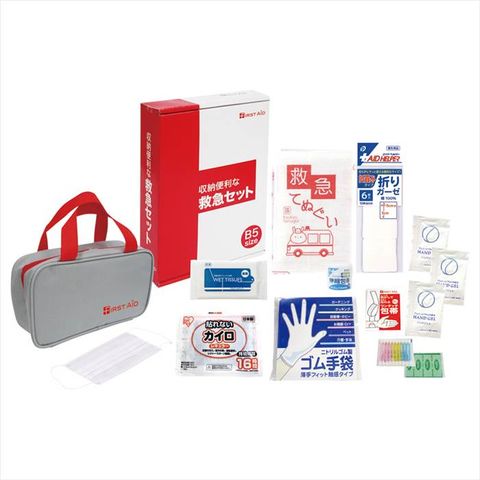 ■商品内容:収納ポーチ(約135×235×60㎜)×1、抗菌伸縮包帯・カイロ・救急てぬぐい・折りガーゼ・除菌ウェットティッシュ・マスク・ワンタッチ包帯・綿棒(10P)・絆創膏(5P)・ゴム手袋×各1、ハンドジェル×3 ポリエステル