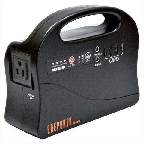 ■商品紹介:コンパクトなポータブル電源。懐中電灯付きで災害時にも安心。1.6㎏の軽量ボディに大容量50400mAリチウムイオン充電池搭載。●出力容量:最大100W●出力端子:AC100V3芯/2芯共通×1、DC12V(外径/内径:φ5.5/φ2.1㎜)×1、USB(DC5V)×4●懐中電灯●充電時間:8~9時間●使用可能時間目安(満充電):LED照明(20W相当)5.5時間、液晶テレビ(32型・70W相当)2時間、スマートフォン充電(電池容量2000mA)約8回