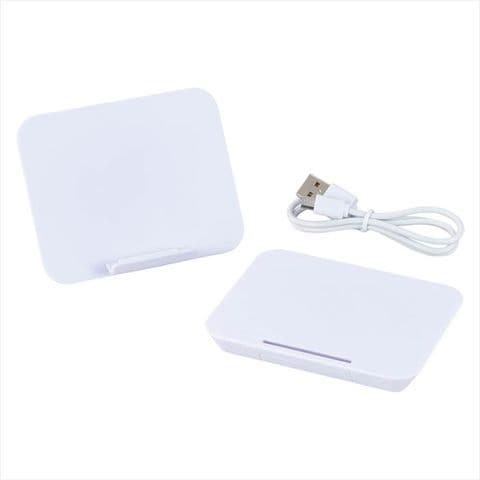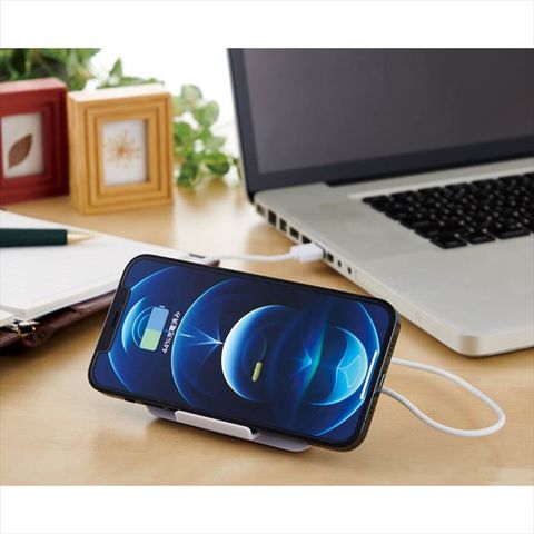 ■商品紹介:Qi対応のスマートフォンを置くだけで充電できるワイヤレス充電器。スタンド機能付。コンパクト設計で、旅行等でも持ち運びラクラク。