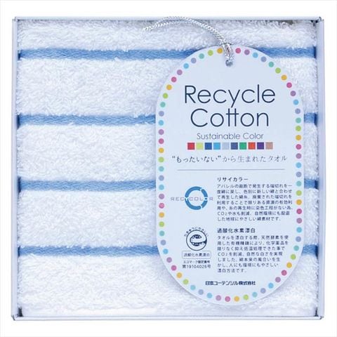 ■商品紹介:焼却処分されていたアパレルの裁断過程で出る端切れを再生した綿糸を使用した”もったいない”から生まれた地球に優しいタオルです。
