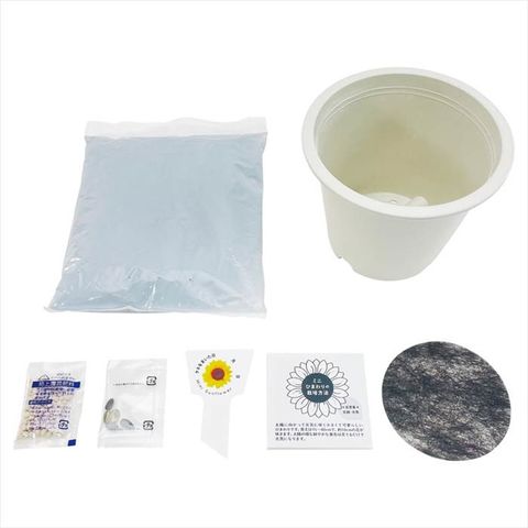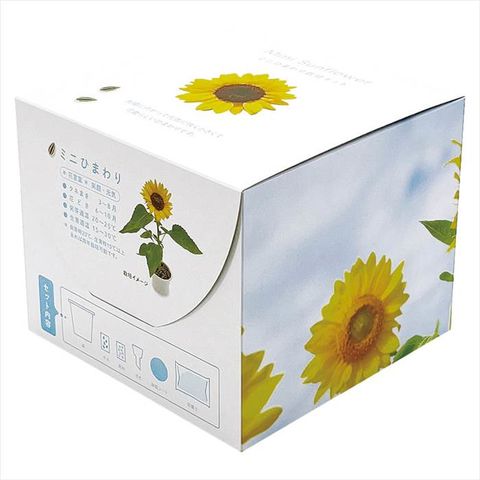 ■商品紹介:室内でも育てられる「ミニひまわり」。栽培に必要な「タネ」「土」「鉢」など一式セットになっています。