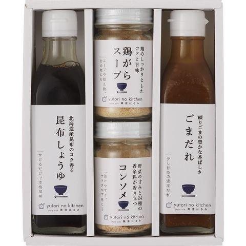 ■商品内容:ごまだれ(245g)・昆布しょうゆ(235g)・コンソメ(70g)・鶏がらスープ(65g)×各1