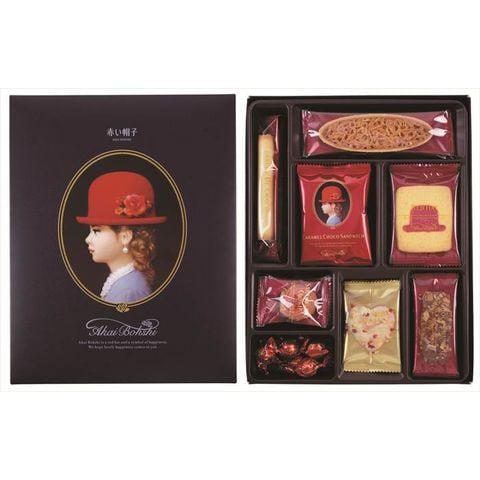 ■商品セット内容:レッドハット×2、キャラメルショコラサンド×2、ストロベリークッキー×2、ナッツベリーハート×2、チョコクランチ×3、ホワイトボール(アップル風味)×5、ラングドシャロール×2、バニラアーモンド×2