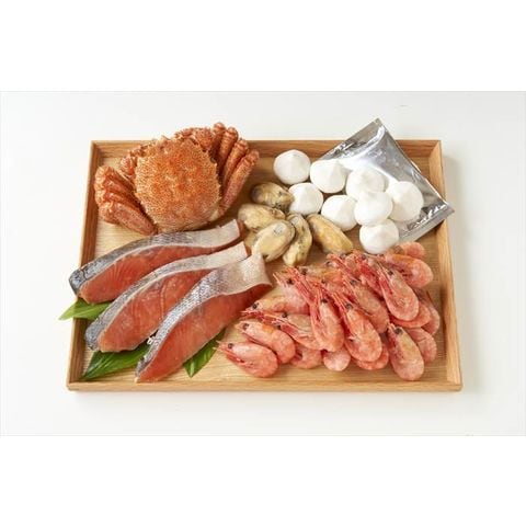 ■商品セット内容:毛ガニ:約330g、鮭切身×3、ボイル海老:約250g、パーナ片貝×5、じゃが玉×8、味噌だれ×1