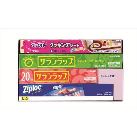 ■商品セット内容:サランラップ(30cm×20m)×1、サランラップ(22cm×20m)×1、ジップロックフリザーバッグ(L5枚入)×1、クックパークッキングシート(Lサイズ30cm×2.5m)×1