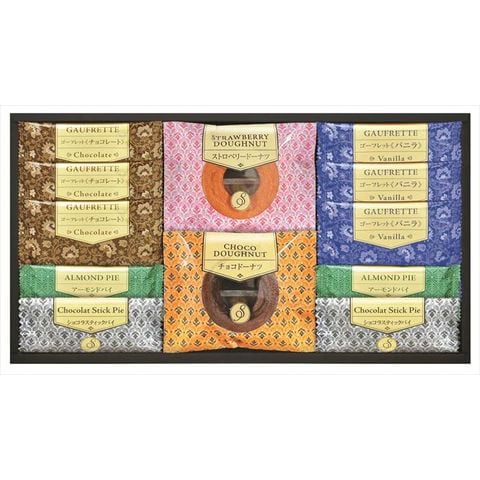■商品セット内容:ゴーフレットチョコ×3、ゴーフレットバニラ×3、アーモンドパイ×2、ショコラスティックパイ×2、焼ドーナツ(チョコ)×1、焼ドーナツ(ストロベリー)×1