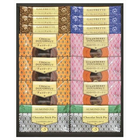 ■商品セット内容:ゴーフレットチョコ×3、ゴーフレットバニラ×3、アーモンドパイ×2、ショコラスティックパイ×2、焼ドーナツ(チョコ)×3、焼ドーナツ(ストロベリー)×3
