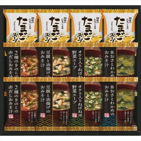 ■セット内容:たまごスープ6.4g×4、とうふと油揚げのおみそ汁、2種のきのこの赤だしおみそ汁、あおさとわかめのおみそ汁、オクラ入ねばねば野菜スープ×各2