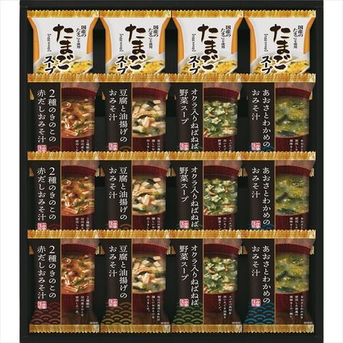 ■セット内容:たまごスープ6.4g×4、とうふと油揚げのおみそ汁、2種のきのこの赤だしおみそ汁、あおさとわかめのおみそ汁、オクラ入ねばねば野菜スープ×各3