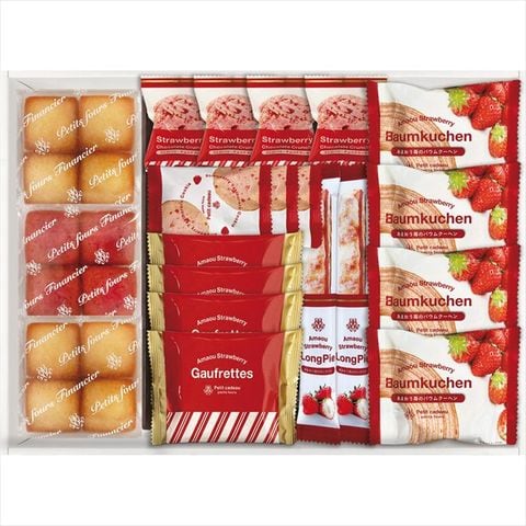 ■セット内容:あまおう苺バウムクーヘン×4、あまおう苺ロングスティックパイ×2、あまおう苺ゴーフレット×4、焼きほろろイチゴクッキー×3、ストロベリーチョコクランチ×4、プチフィナンシェ4個入(あまおう苺、プレーン×2)