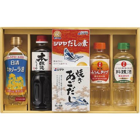 ■商品内容・サイズ:サンビシ本醸造しょうゆ(500ml)・日の出料理酒・日の出割烹みりんタイプ(各400ml)・日清キャノーラ油(350g)・シマヤだしの素粉末(10g×6袋)・シマヤ焼きあごだし(8g×6袋)×各1