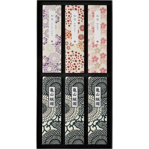 ■商品内容・サイズ:亀山五色蝋燭(約35g)×3、和遊線香(ラベンダー・桜・白梅)(各約30g)×各1