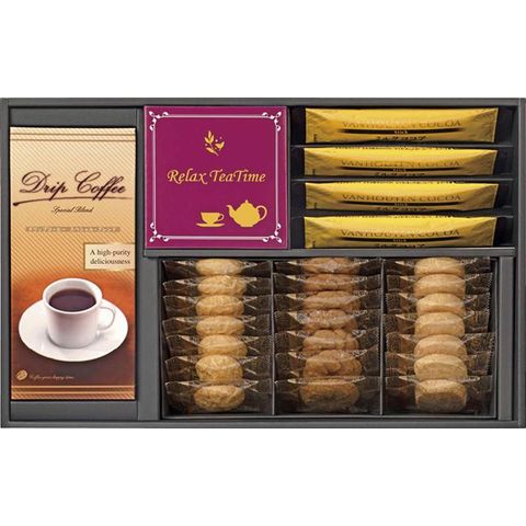 ■商品内容・サイズ:クッキー(ジャムピール・フルーツ・ディアマン)×各7、バンホーテンミルクココア×4、ダージリンティーバッグ(6袋)・モンカフェドリップコーヒー(スペシャルブレンド)(4袋)×各1