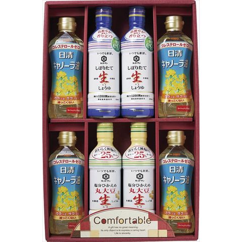 ■商品内容・サイズ:日清キャノーラ油(350g)×4、キッコーマン(しぼりたて生しょうゆ・塩分ひかえめ丸大豆生しょうゆ)(各450ml)×各2