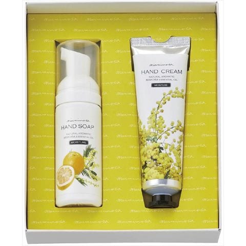 ■商品紹介:ミモザ精油(天然香料)がふんわりと柔らかく香る、するすると伸びる滑らかな使い心地のハンドクリームとさわやかで心落ち着くひとときへと誘う天然香料の香りを楽しみながら、手洗いの時間が素敵なリフレッシュタイムとなるハンドソープのセットです。