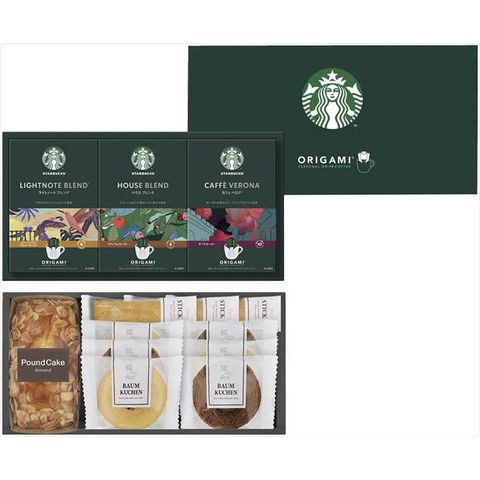 ■商品内容・サイズ:バウムクーヘン(ココア・バニラ)・スティックパイ(プレーン)×各3、スターバックスオリガミドリップコーヒー(ハウスブレンド・カフェべロナ・ライトノートブレンド)(各9g×4p)・アーモンドパウンドケーキ×各1