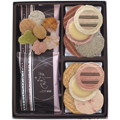 ■商品内容・サイズ:えびのだんらん×4、黒ごまえび煎餅・ふた焼ごま×各3、紅白せんべいチーズサンド・ふた焼辛子明太子・紅生姜えび煎餅×各2