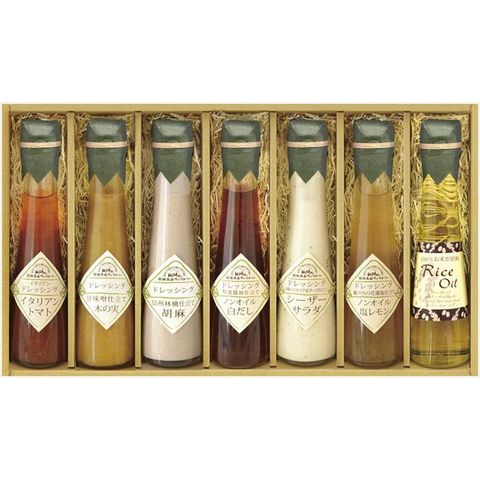 ■商品内容・サイズ:ドレッシング(イタリアントマトのイタリアン・甘味噌仕立て木の実・信州林檎仕立て胡麻・2種のイタリア産チーズ仕立てシーザーサラダ)・特選醤油仕立てノンオイル白だしドレッシング・瀬戸内の花藻塩仕立てノンオイル塩レモンドレッシング(各120ml)・米油(110g)×各1
