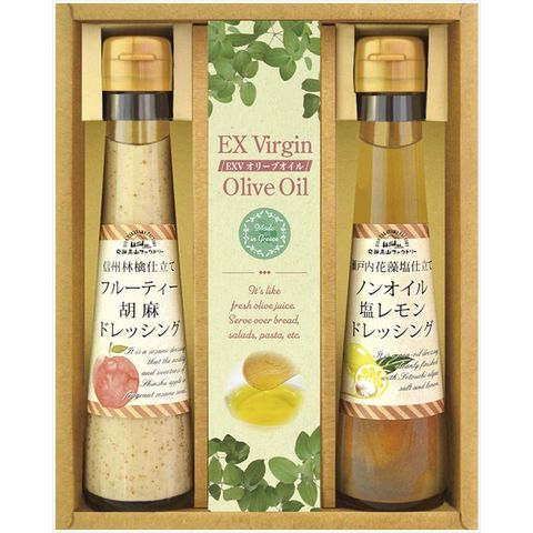 ■商品内容・サイズ:信州林檎仕立てフルーティー胡麻ドレッシング・瀬戸内花藻塩仕立てノンオイル塩レモンドレッシング(各120ml)・エクストラバージンオリーブオイル(8g×5p)×各1