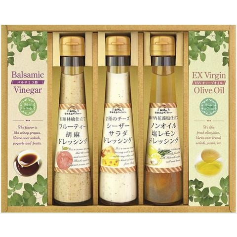 ■商品内容・サイズ:ドレッシング(信州林檎仕立てフルーティー胡麻・2種のイタリアンチーズシーザーサラダ)・瀬戸内花藻塩仕立てノンオイル塩レモンドレッシング(各120ml)・エクストラバージンオリーブオイル(8g×5p)・バルサミコ酢(3.3ml×5p)×各1