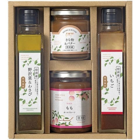 ■商品内容・サイズ:ドレッシング(野沢菜&わさび・いちご)(各150ml)・ももスプレッド (140g)・きな粉&バターペースト(110g)×各1