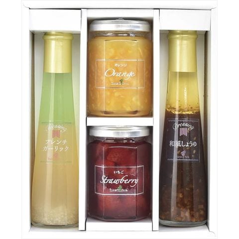 ■商品内容・サイズ:ジャム(オレンジマーマレード・いちご)(各145g)・ドレッシング(フレンチガーリック・和風しょうゆ)(各122ml)×各1