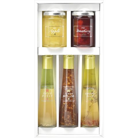 ■商品内容・サイズ:ジャム(りんご・いちご)(各145g)・ドレッシング(フレンチガーリック・ノンオイルゆずしょうゆ・イタリアンハーブ)(各122ml)×各1