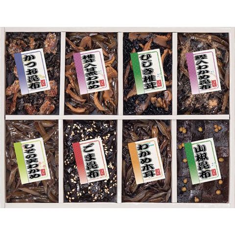 ■商品内容・サイズ:わかめ木耳(50g)・しその実わかめ・椎茸入甘煮わかめ(各45g)・ごま昆布・山椒昆布・ひじき椎茸・鰹入わかめ昆布(各40g)・かつお昆布(18g)×各1