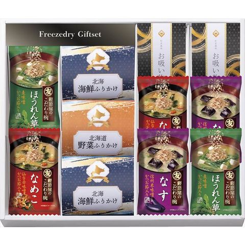 ■商品内容・サイズ:北海海鮮ふりかけ(3g)×4、松茸お吸い物(2袋)・フリーズドライ味噌汁(なす・なめこ・ほうれん草)・北海道野菜ふりかけ(3g)×各2