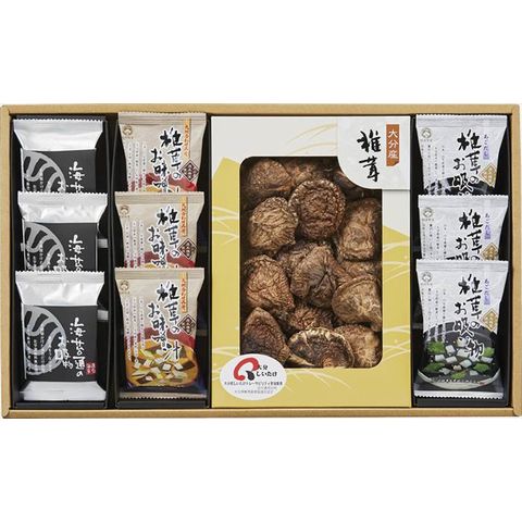 ■商品内容・サイズ:椎茸お味噌汁(九州合わせみそ)・椎茸お吸い物(あごだし)・海苔お吸物×各3、大分産原木乾椎茸どんこ(70g)×1