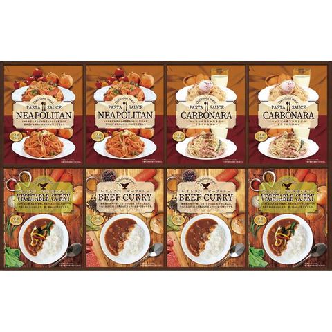 ■商品内容・サイズ:パスタソース(ナポリタン・カルボナーラ)(各250g)・ビーフカレー・ベジタブルカレー(各180g)×各2