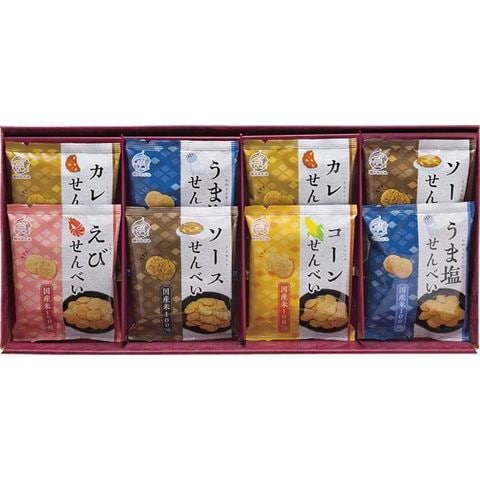 ■商品紹介:香ばしいえびの風味で後引く旨さの「えびせんべい」、香ばし醤油仕立ての「コーンせんべい」、あおさ海苔を練り込みソースの旨みを堪能できる「ソースせんべい」、シンプルな美味しさでお米を味わう「うま塩せんべい」とスパイシーなカレー風味の「カレーせんべい」をセットにした米菓詰合せです。