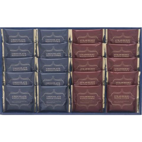 ■商品紹介:サクサク食感のワッフルクッキーにホワイトチョコクリームを詰めた風味豊かなショコラワッフルクッキーといちごチョコクリームを詰めたいちごワッフルクッキーの詰合せです。