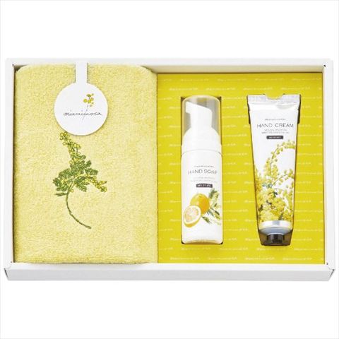 ◆商品紹介:春を告げる花ミモザをモチーフとした今治タオルと、天然香料ミモザ精油とグレープフルーツの香りが爽やかな、アミノ酸系洗浄成分配合のクリーミィーな泡で手肌をやさしく洗い上げるハンドソープと、天然香料ミモザ精油がふんわりと柔らかく香る、するすると伸びる滑らかな使い心地のハンドクリームのセットです。